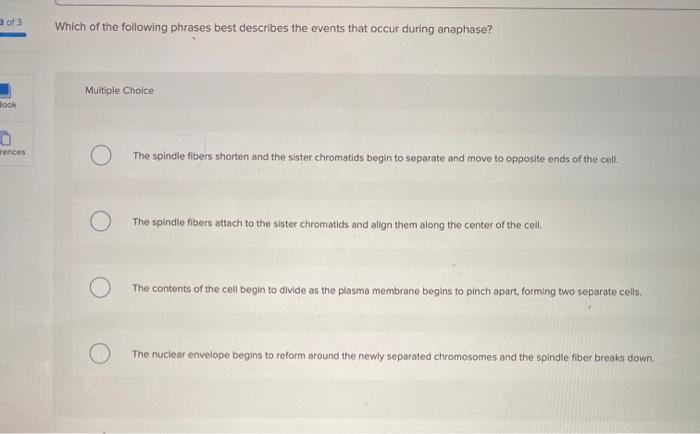 Of a Which of the following phrases best describes the events that occur during anaphase. The best description of the events occurring during Ana-phase I of meiosis. 1 What best describes the term crossing over.